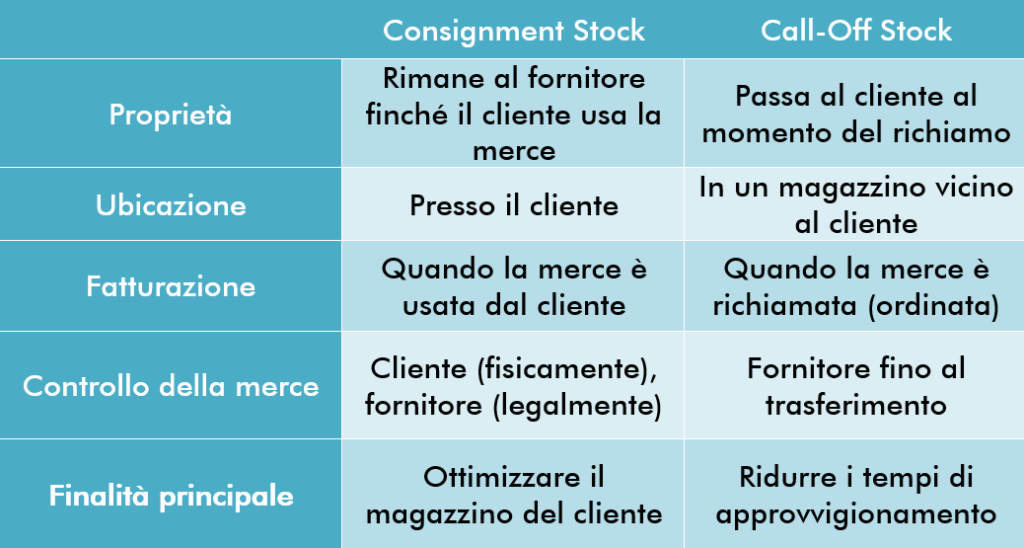 Per assolvere a questa esigenza si può ricorrere ai regimi di consignment stock e call-off stock: sono due modalità di gestione delle scorte che si usano tra fornitori e clienti in ambito industriale o commerciale. Anche se possono sembrare simili, ci sono differenze fondamentali tra i due.