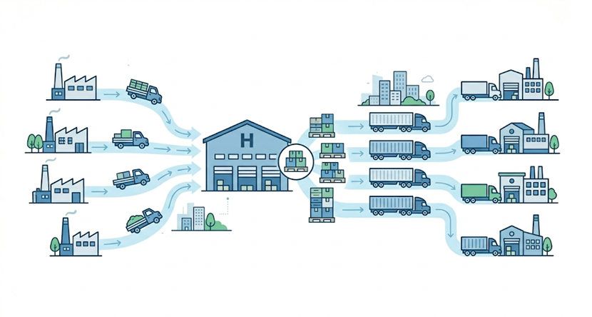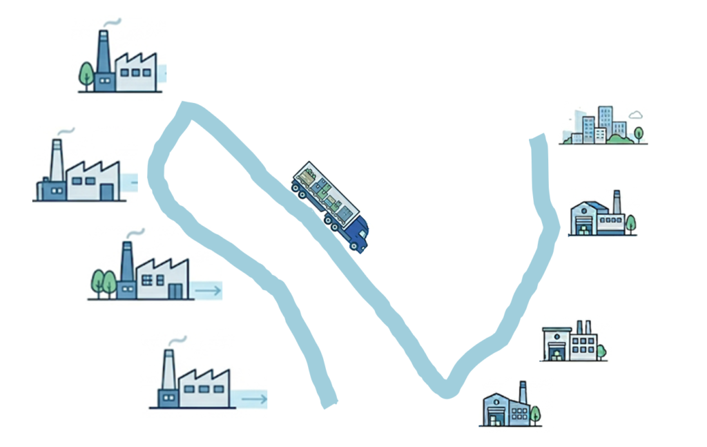 Il vettore ritira con regolarità il carico presso i mittenti in una determinata area e lo consegna a un magazzino di consolidamento, dove viene – generalmente tramite cross-docking – trasferito su camion più grandi e portato a un magazzino di distribuzione in un’altra area.
