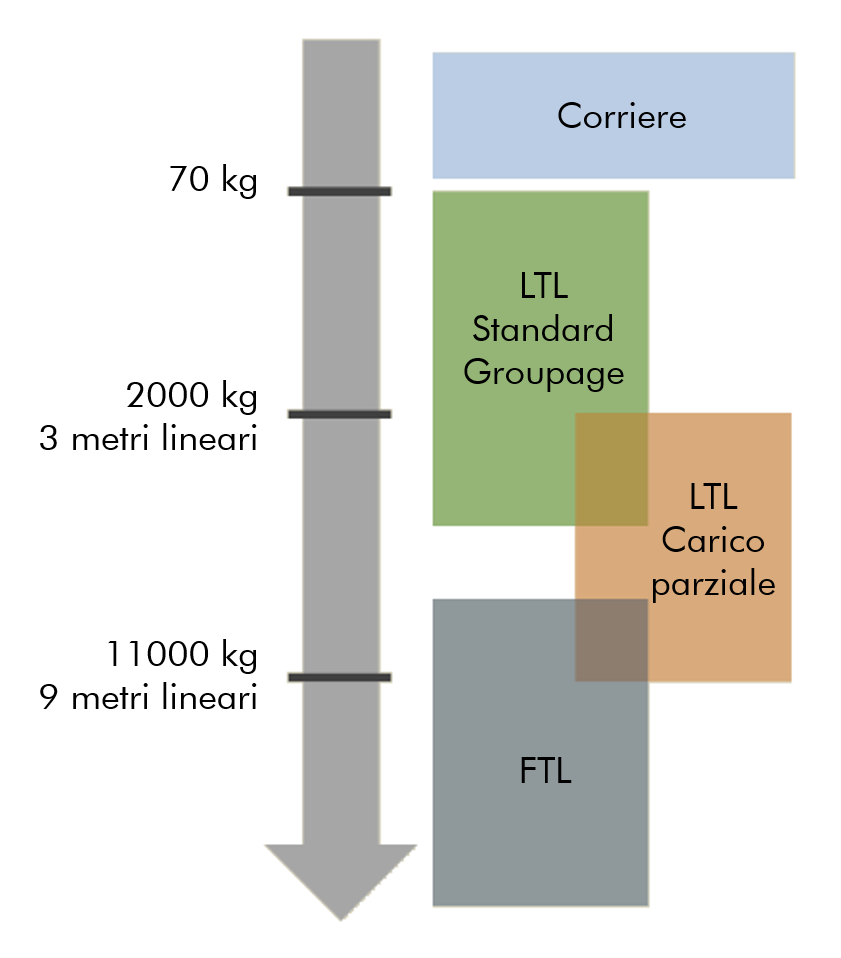 Lo speditore paga solo per la parte del camion che utilizza, in genere in base allo spazio occupato (di solito in metri lineari, peso o numero di pallet) e possono essere applicati costi aggiuntivi o supplementi paragonabili a quelli previsti per il trasporto a carico completo. Vediamone una rappresentazione grafica: